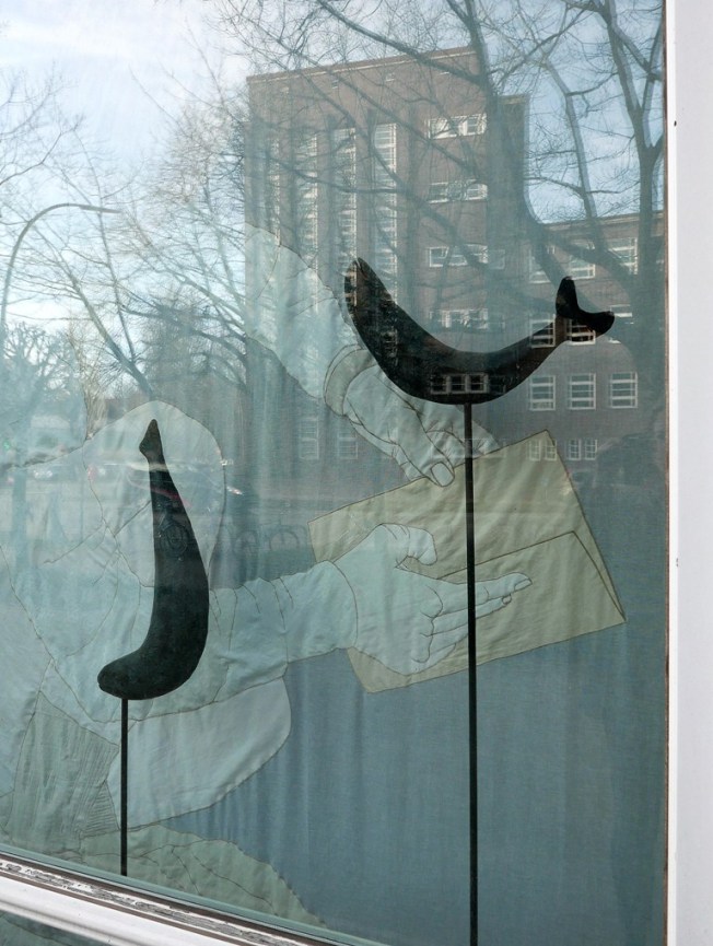 Was du siehst, sind die Schaufenster einer Bildhauerin und einer Textildesignerin, in denen sich ein kleiner Teil Eimsbüttels spiegelt, während die Fotografin fleißig Kniebeugen macht.