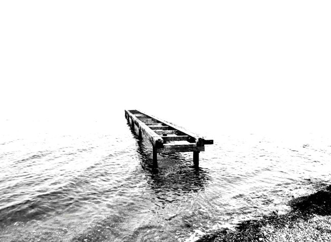 Die Überreste des Stegs in der Ostsee ließen mich an eine Skultur des Schweden Richard Brixel denken, die ich auf der diesjährigen NordArt gesehen hatte: Balance on a tight rope. Beide hatten Lust, sich ein wenig filtern zu lassen.