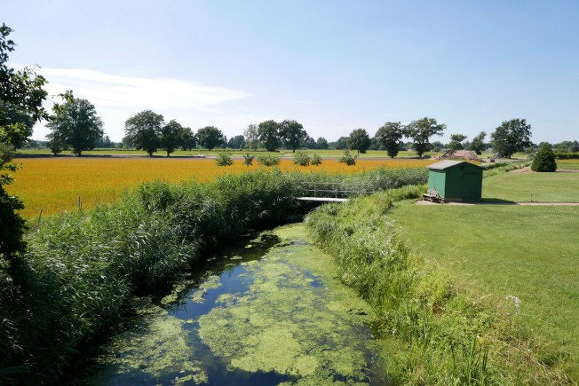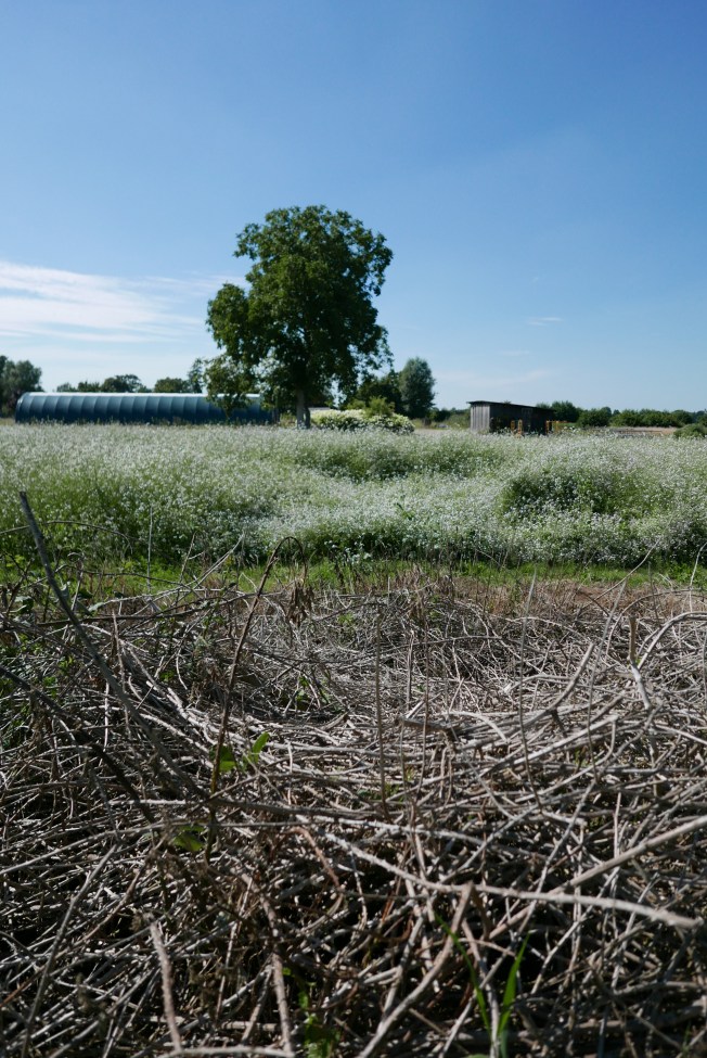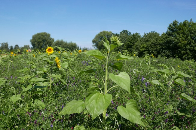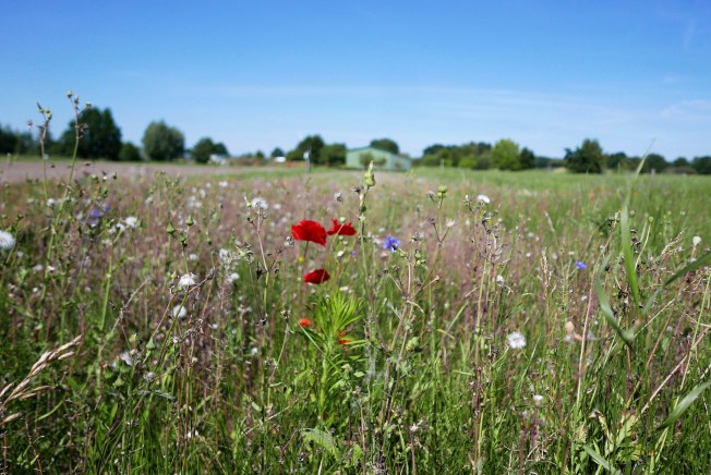“Das meiste ist Unkraut. Was weiß ist, ist Unkraut”, sagt der alte Mann und steigt neben mir vom Rad. Ich sehe viel Weiß und dazwischen viel blauen Himmel. „Aber schön ist‘s“, sage ich und knipse weiter. „Na ja…“, meint er. „Mit den Lupinen hat es nicht so geklappt. Und die Sonnenblumen mickern auch. Wenn Sie was richtig Schönes sehen wollen, müssen Sie sich die Wiese am Ende des Ackers ansehen.“ Spricht‘s und schwingt sich wieder auf sein Rad. Ich schwinge und radele hinterher, den sanften Deichhang hinab und dann immer den Löwenzahn-bewachsenen Weg entlang. Am Ende: Was für eine Pracht!