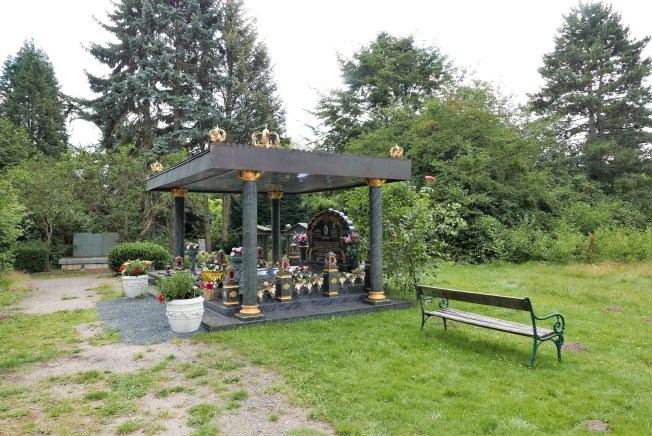 Wer die Inschrift liest, ahnt: Hier liegt einer begraben, der königlich geliebt worden sein muss. Und wahrscheinlich immer noch wird. Auf der Bank gleich neben dem Pavillon jedenfalls sitzen oft Angehörige, erzählt mir eine Anwohnerin, die gerade mit ihrem Hund vorbei spaziert. Da werde dann auch mal ein Schnaps getrunken, und auch dem Toten stelle man ein Gläschen auf die Grabplatte. Besonders an Weihnachten und Ostern werde ordentlich gefeiert.