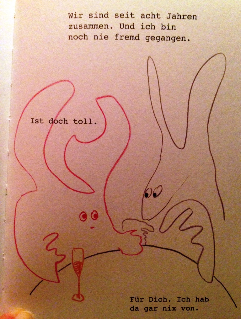 Den kleinen Comic über das Fremdgehen brachte Freundin K. von einem Ausflug in die Bundeshauptstadt mit – leider ohne den Namen der KünstlerIn. Falls jemandem die Zeichnung oder dieser ganz eigene Sound bekannt vorkommt: Ich freue mich über Hinweise.
