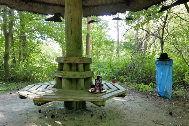 Auf dem kleinen Rastplatz im Wald steht eine überdachte Rundbank. Auf der Bank ein silberfarbenes Tablett mit einer rubinroten Glaskaraffe und zwei dazu passenden Gläsern. Ein Stück entfernt ein drittes Glas, orangerot und kleingemusterter als das Trio auf dem Tablett. Die Karaffe und die Gläser sind leer und vollkommen trocken. Auf dem aufgespannten blauen Müllbeutel neben der Bank ruht ein schwarzer Filzhut. Der Hut ist von einer dünnen Staubschicht bedeckt. Weit und breit ist kein Mensch zu sehen. Unwillkürlich beginne ich mir auszumalen, wer all die Dinge zurückließ, als er oder sie diesen Ort verließ. Ein Paar vielleicht, das auf etwas Besonderes anstoßen wollte? Er hatte den Hut abgenommen, weil ihm irgendwie feierlich zumute war. Vielleicht war ihm auch einfach nur heiß. Am spannendsten finde ich das dritte Glas ein wenig abseits. Ich stelle mir vor, dass es für eine Person aufgestellt wurde, die gar nicht anwesend war, aber doch irgendwie dazu gehörte. Aber warum blieben die Dinge zurück, wenn sie doch einen so wichtigen Moment bezeugen?