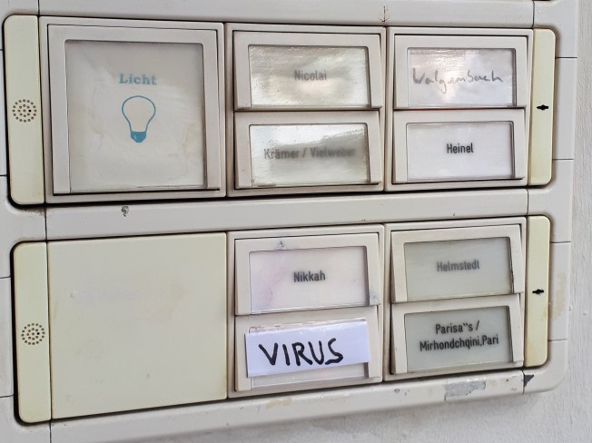 Man kann sich seine Nachbarn eben nicht aussuchen, sagte ich zu der alten Nachbarin, als wir gestern Vormittag vor der Haustür zusammenstießen. Sie grinste. Da hatte doch tatsächlich irgendein Spaßvogel „Virus“ auf eines der Klingelschilder geschrieben! Die Corona-Witze waren auch schon mal lustiger, sagte ich noch. Sie nickte: Bleiben Sie gesund! Vorhin traf ich an gleicher Stelle auf den Hausmeister, ein druckfrisches Klingelschild in der Hand. Ich hoffe, die neuen Nachbarn sind ansteckend sympathisch…