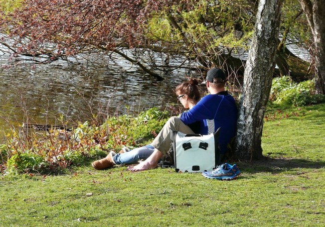 Frühling in Hamburg ist, wenn es Mensch und Menschin zum Sonnenbaden und Kuscheln ans Wasser zieht, mag auch die eine noch Pelzstiefel tragen, während der andere schon die Zehen ins Gras streckt.
