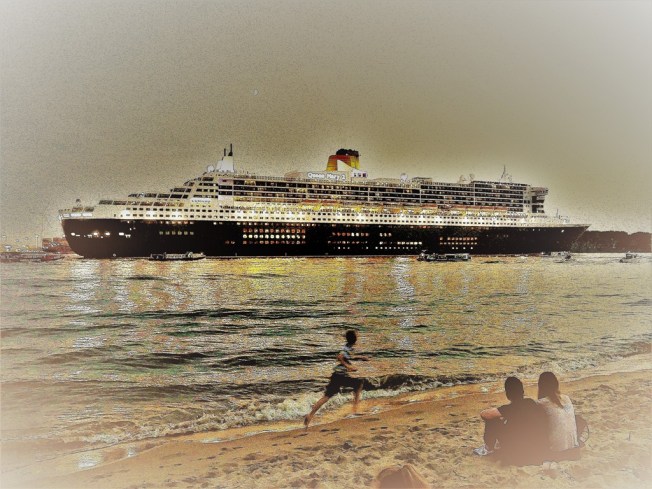 Andere müssen für vergleichbare Ausblicke deutlich längere Wege zurücklegen. Dafür haben sie vermutlich mehr Platz an Bord – wie die Passagiere der Queen Mary 2, die an allerlei Picknickdecken vorbei in den Sonnenuntergang schipperte.