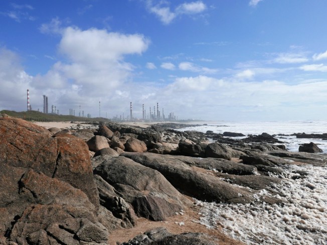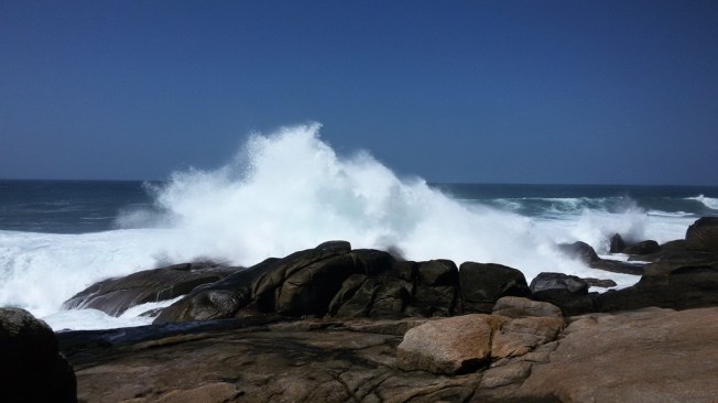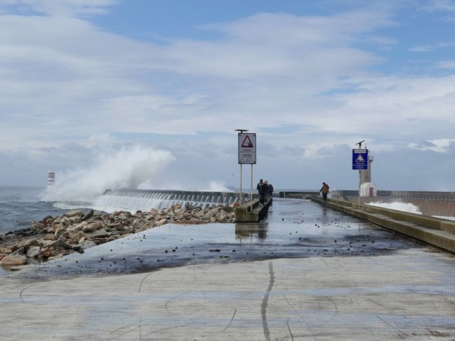 Muxía ist ein Ort mit viel Wetter. An diesem Tag bläst der Wind aus Leibeskräften. Tanzend, rollend, schnaubend bahnt sich die See ihren Weg ans Ufer. An den vorgelagerten Felsen ruft sie die tollsten Explosionen hervor. Welch eine Kraft! Eine vorwitzige Passantin reißt es um ein Haar in die Fluten.