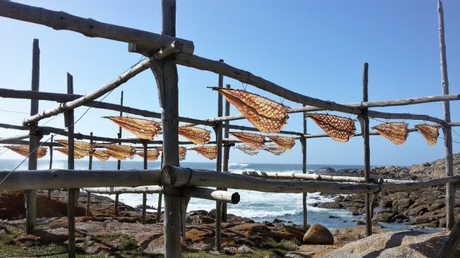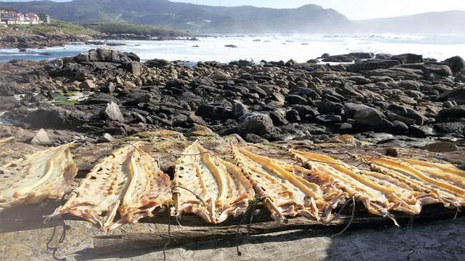 Wie weit können fliegende Fische wohl fliegen? Diese nicht so weit, sagt Juan und lacht. Seit seinem 14. Lebensjahr verarbeitet der 88-Jährige Congrio (Meeraal) zu den schönsten Kunstwerken. Mit dem Messer schneidet er in regelmäßigen Abständen Löcher in die Tierleiber, damit sie auf den hölzernen Gestellen am Meer besser trocknen. Die Konservierungsmethode haben einst die Katalanen nach Muxía gebracht. Anders als der in Galicien (und Portugal) stärker verbreitete Bacalao (Stockfisch) wird Congrio nicht gesalzen. Trotzdem muss man ihn vor dem Verzehr 48 Stunden wässern, sagt Juan, der Konsistenz wegen. Am besten schmecke er mit Kicherebsen.