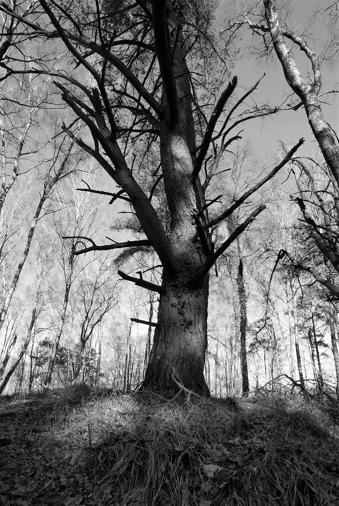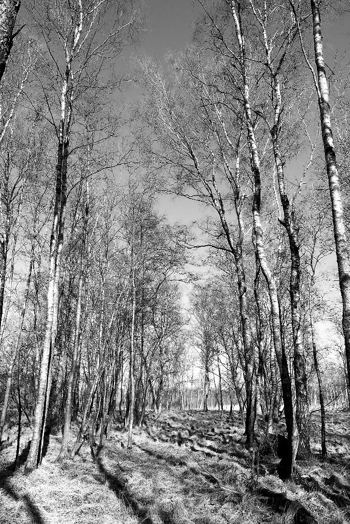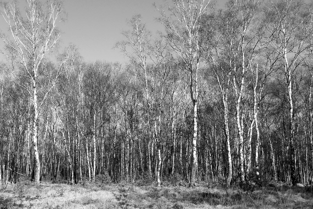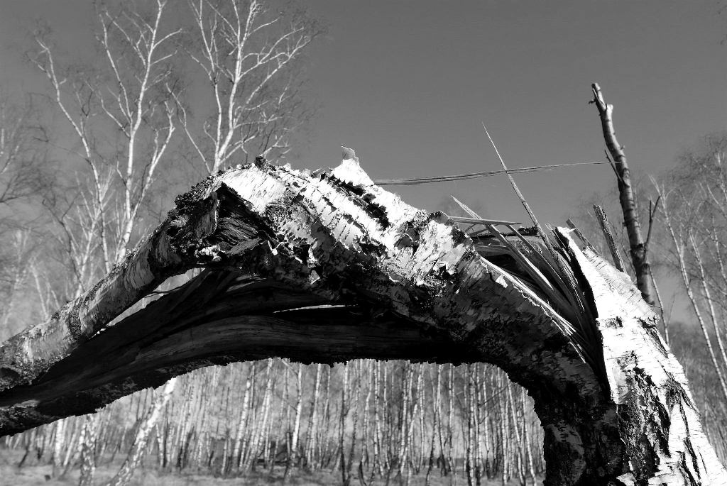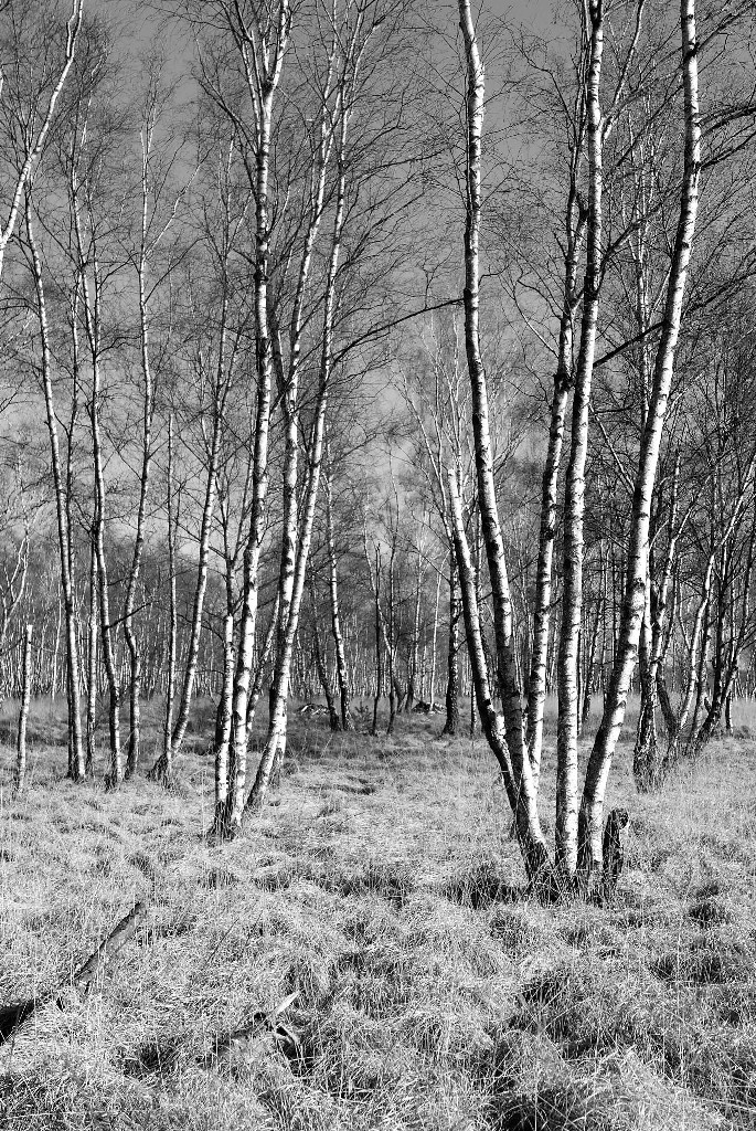 Die zarten Birken entfalten ihren vollen Zauber aus meiner Sicht erst beim Blick in den blauen Milchglasspiegel. Und der geborstene Ast im Himmelsblau ist der lustige Geselle, dem ich auf meinem Spaziergang begegnete, und kein Stämme fressendes Monster wie in Schwarz-Weiß.