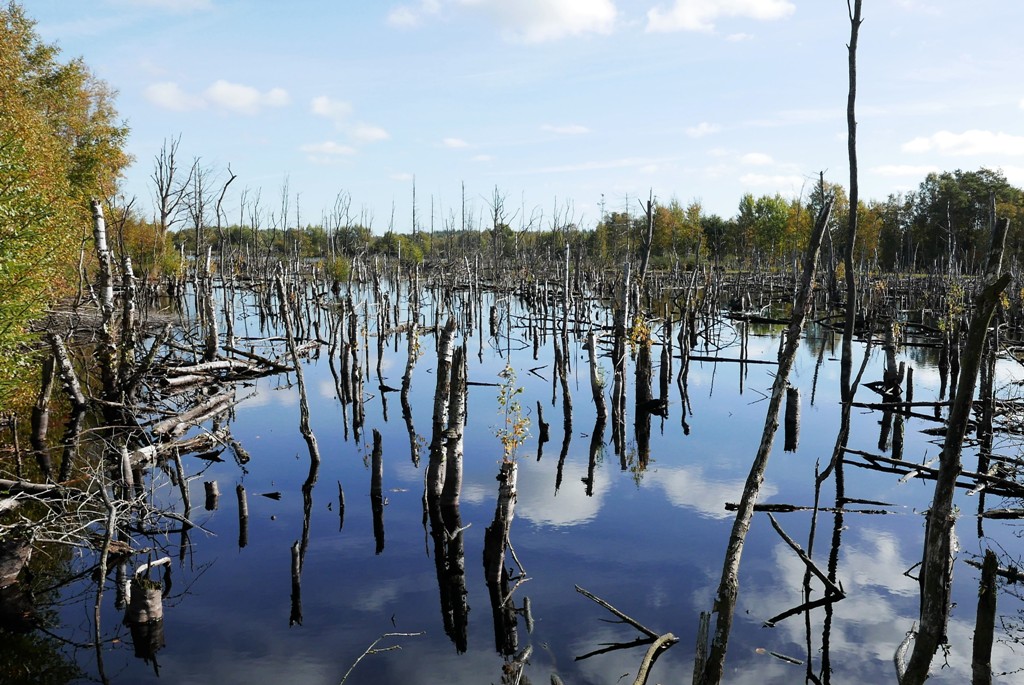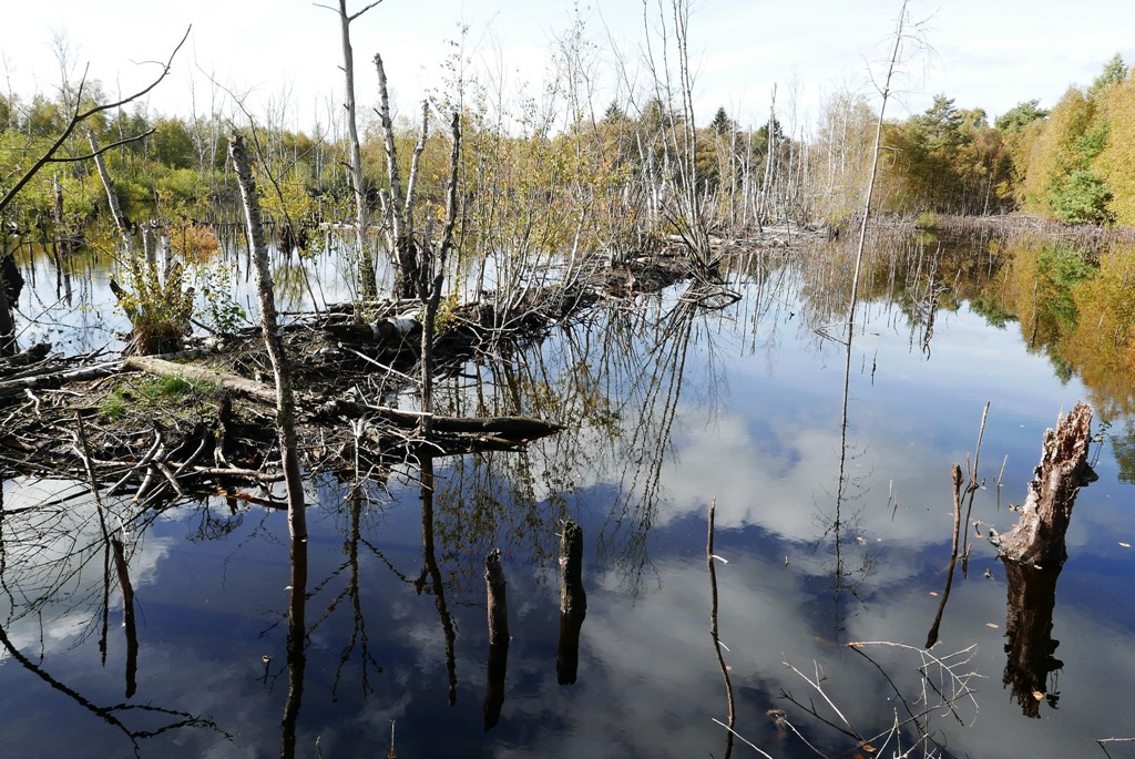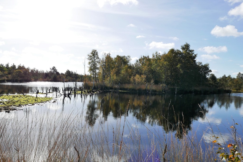 Hoch über einen grauen See,