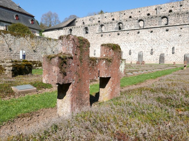 Der ehemalige Kreuzgang ist seit 1960 eine Kriegsgräberstätte. Dort ruhen, wie auf einer Tafel am Eingang nachzulesen ist, „450 Opfer des Krieges und nationalsozialistischer Gewalt: 210 deutsche Soldaten und Zivilpersonen, 1 Belgier, 1 Lette, 1 Luxemburgerin, 3 Niederländer, 49 Polen, 1 Rumäne, 49 Sowjetrussen, 1 Tscheche, 6 Ungarn sowie 128 unbekannte Tote – darunter 81 Frauen und 6 Männer, die im Arbeitslager Hirzenhain von Gestapo und SS erschossen worden sind“. Ein stiller Ort, von Klostermauern sicher umschlossen. Zwischen den Gräbern stehen niedrige steinerne Kreuze, manche allein, andere zu zweit oder zu dritt. Im Hintergrund plätschert ein Brunnen.