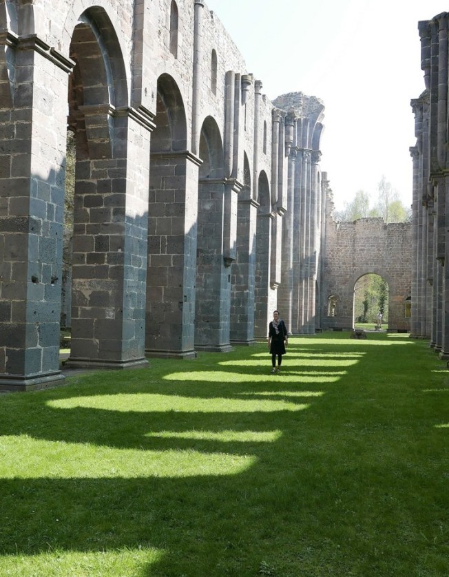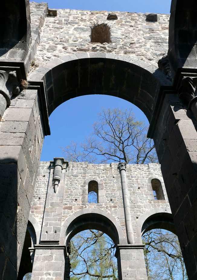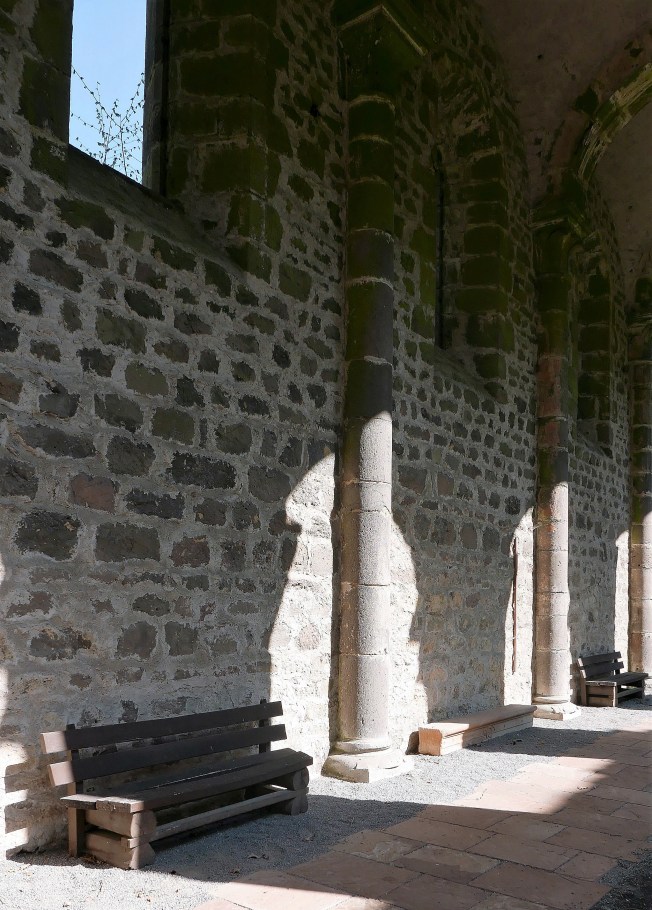 Die spätromanischen und frühgotischen Teile der Kirche sind als Freiluftensemble erhalten. An diesem Frühlingstag, der schon den Sommer in sich trägt, lässt der Himmel die zwischenzeitlich restaurierten alten Mauern erstrahlen, dass es eine Pracht ist, wirft das kräftige Licht Säulen und Rundbögen als Schattenrisse ins Gras, während sich dort, wo einst der Altar gestanden haben mag, ein Baumstamm ans Gemäuer schmiegt.