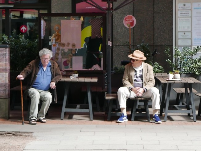 Tief in Gedanken oder vielleicht auch ganz ohne sitzt die grauhaarige Frau vor der Bäckerei. Wenn du mit ihr ins Gespräch kommen willst, wendest du dich am besten an ihren Hund. Freundlich, aber bestimmt, einer Vorzimmerdame nicht unähnlich, wacht er an ihrer Seite. Der Mann mit dem Hut ein paar Bänke weiter schaut bald nach links, bald nach rechts. Schwungvoll dreht er sich dem Neuankömmling am Nachbartisch zu, als wollte er sagen: endlich! Kurz hebt der andere den Blick, senkt ihn in den eigenen Schoß sodann. Einer von beiden bräuchte vielleicht einen Hund.