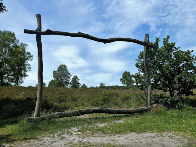 Endlich ein Stück Heide. Am Häteler Berg kämpft eine kleine Fläche, unterstützt von aktiven Bürgern, gegen Verbuschung und Verwaldung. Still ist es. Bis auf das immer fernere Feuer der Geschütze, das sich gelegentlich über das Lied des warmen Windes legt. Oberhalb von Müden, wo Wacholder sich und Eiche küssen, lädt ein paar Stunden später eine Bank zur ausgedehnten Rast. Hier fand der Heimatdichter Hermann Löns seine Seelenlandschaft, hier wurde ihm ein Denkmal gesetzt. „Lass deine Augen offen sein, geschlossen deinen Mund und wandle still, so werden dir geheime Dinge kund.“ Schön hat er das gesagt, finde ich. Was man sieht, wenn man die Augen offen hält, hat der große Arno Schmidt, der bis zu seinem Tod in dem Dörfchen Bargfeld gar nicht weit entfernt lebte, so formuliert: „Gebt mir Flachland, mit weiten Horizonten; Kiefernwälder, süß und eintönig, Wacholder und Erika; und an der Seite muss der weiche staubige Sommerweg hinlaufen, damit man weiß, dass man in Norddeutschland ist.“