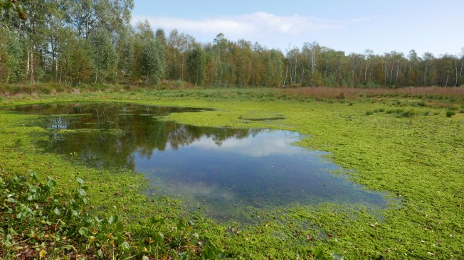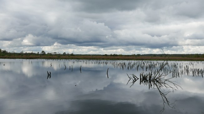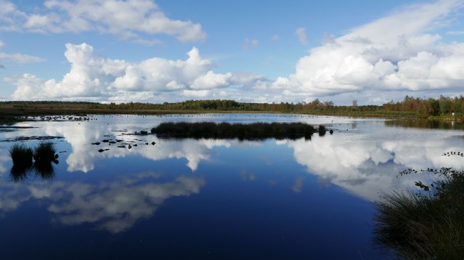 Wow, dieser Ort trägt seinen Namen zu Recht! Zumindest an einem bewegten Tag wie heute. Schwer lasten die Wolken auf dem Wasser, als ich mich dem Himmelmoor bei Quickborn vom Torfwerk aus nähere. Nur ein schmaler Streifen Land trennt das satte Grau oben von dem satten Grau darunter.