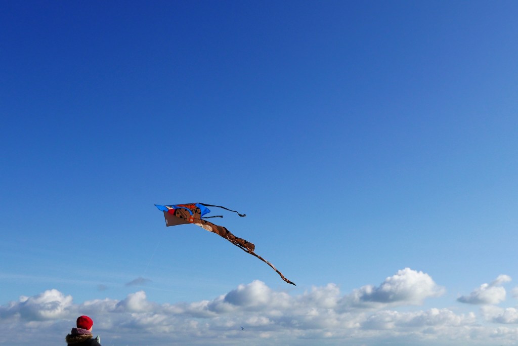 Ein Junge lenkt seinen Drachen über die Wolken.
