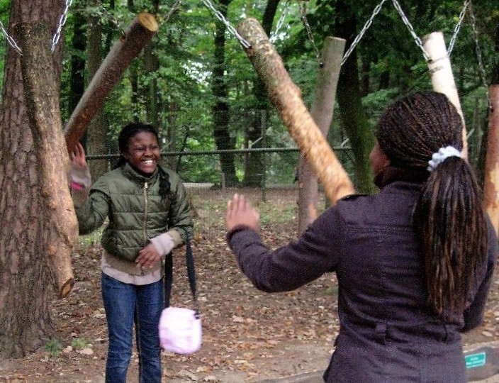 Die Besucherin betrachtet die Kussszene vor sich. Was sie denkt, ist hinter der Maske, die einen Großteil ihres Gesichts bedeckt, nicht zu erkennen. Ob ihr bewusst ist, dass der Dritte im Bilde wiederum sie zu beobachten scheint? Und die Fotografin sie und den Dritten und die Kussszene? Wie geschlossen (und frei von Voyeurismus) wirkt dagegen das Geschehen in der zweiten Aufnahme: Maskenträgerinnen unter sich, beinahe schon eine Begegnung auf Augenhöhe.