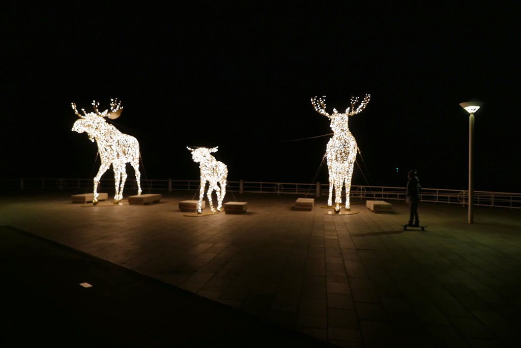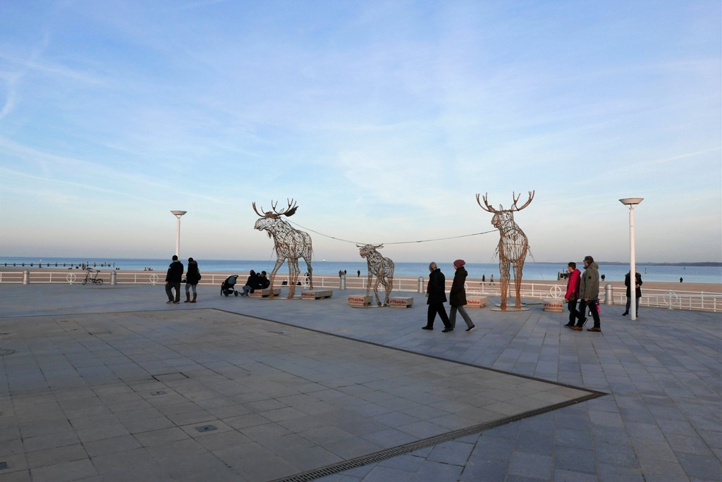 Blau war die Stunde. Blau das zarte Band, das der Vorfrühling durch die überraschend lauen Lüfte über der Lübecker Bucht flattern ließ. Umso mehr staunten all die Grauhimmel-Müden, die an diesem Wochenende über die Travemünder Promenade spazierten, als sie auf eine Tierfamilie trafen, die um diese Jahreszeit so niemand mehr (respektive: noch niemand) erwartet hätte, schon gar nicht am Ostseestrand. Die Flaneure reagierten mit Staunen, Lachen und den unvermeidlichen Selfies. Und aus dem Himmelsblau ertönte die Stimme des im Dezember verstorbenen Dichters und Zeichners F.W. Bernstein: „Die schärfsten Kritiker der Elche waren früher selber welche…“